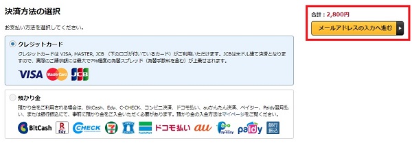 - 「熟女チャンネル」の利用料をクレジットカードで支払うか、預かり金にするかを選択して「メールアドレスの入力へ進む」ボタンをクリックします。預かり金で支払う場合は、入会前にDUGA(デュガ)に入金する必要があります。ここではクレジットカードでの支払い方で進めていきます。