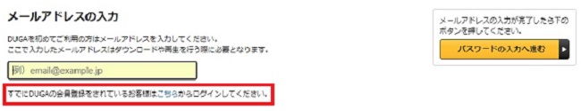- DUGA(デュガ)に会員登録されている方は画面下からログイン画面に移動してください。まだ会員登録されていない方は、DUGA(デュガ)で利用するメールアドレスを入力をしてパスワードを設定すれば会員登録ができます。