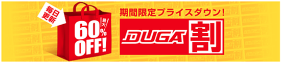 DUGA(デュガ)を利用するメリットにお得な割引サービスがあります。1つ目は、「DUGA割」です。特定のアダルト動画作品が、一定期間割引価格で購入することができます。作品によっては最大で60%割引になっている場合があります。ジャンルやレーベルを問わず毎日更新されているので、購入を迷っているAV作品があるときは、その作品がセール対象になっているかをチェックしてみてはいかがでしょうか。DUGA(デュガ)のトップページにある「期間限定セールDUGA割」からセール対象になっているアダルト動画を調べることができます。