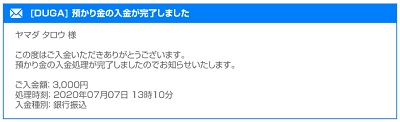 銀行の営業時間内(平日9時~15時)に振込手続きを行うと30分以内でDUGA(デュガ)への入金が完了します。振込が完了したらマイページにログインして預かり金残高に反映されているかを確認してください。