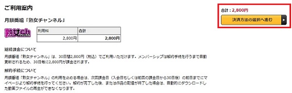 - 「熟女チャンネル」のご利用案内が表示されるので利用料などを確認して「決済方法の選択へ進む」ボタンをクリックします。