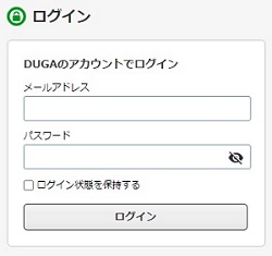 - DUGA(デュガ)に会員登録されている方は画面下からログイン画面に移動してください。まだ会員登録されていない方は、DUGA(デュガ)で利用するメールアドレスを入力をしてパスワードを設定すれば会員登録ができます。