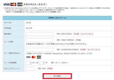 - クレジットカード情報を入力して「申込確認」ボタンをクリックします。
