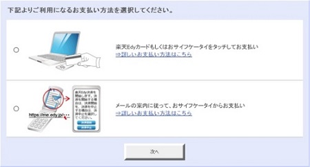 おサイフケータイを利用するか楽天Edyカードで支払いするかを選択して、それぞれの画面の指示に従って決済手続きを行てください。楽天Edyカードを使う場合はFeliCaポート/パソリが必要になります。